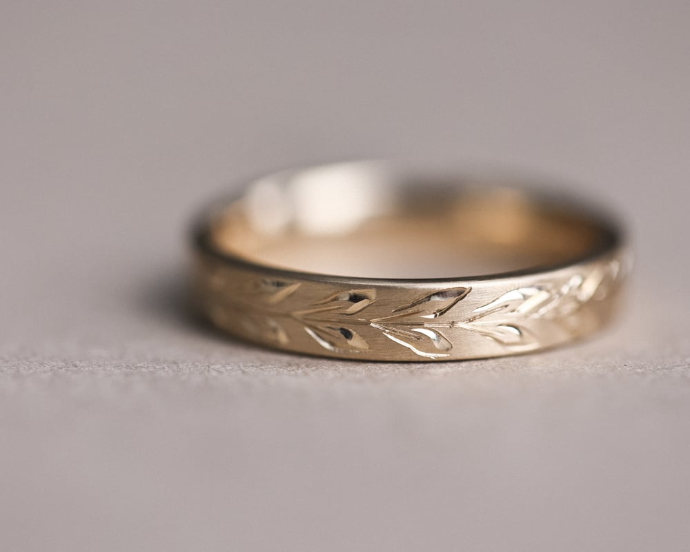 18ct Rose gold 2mm flat court ‘Olive leaf’ engraved ring
