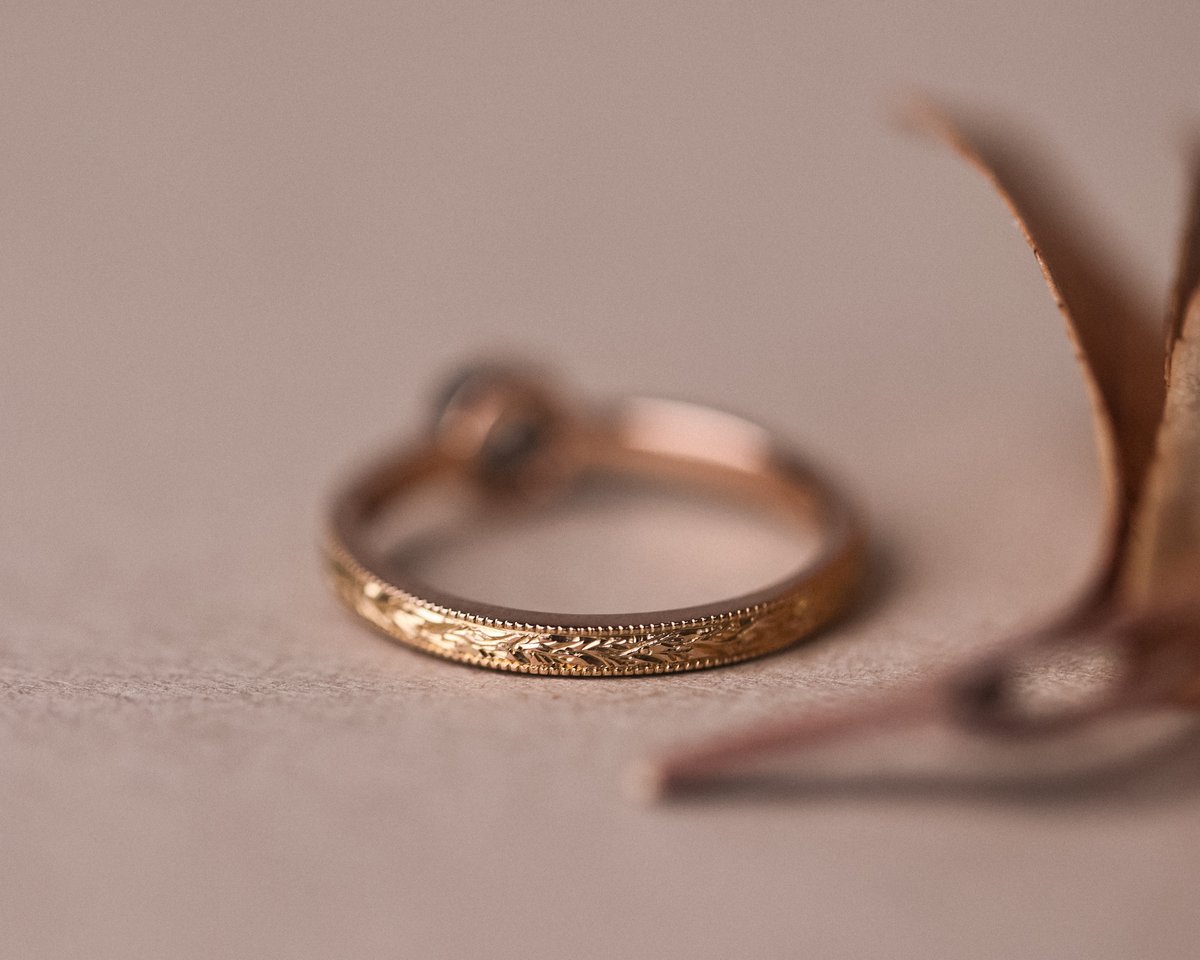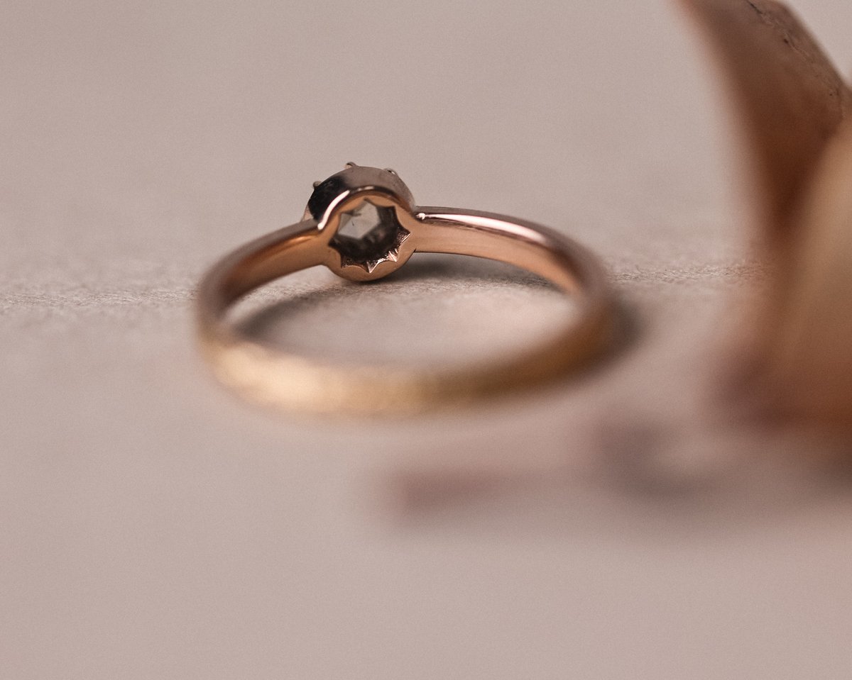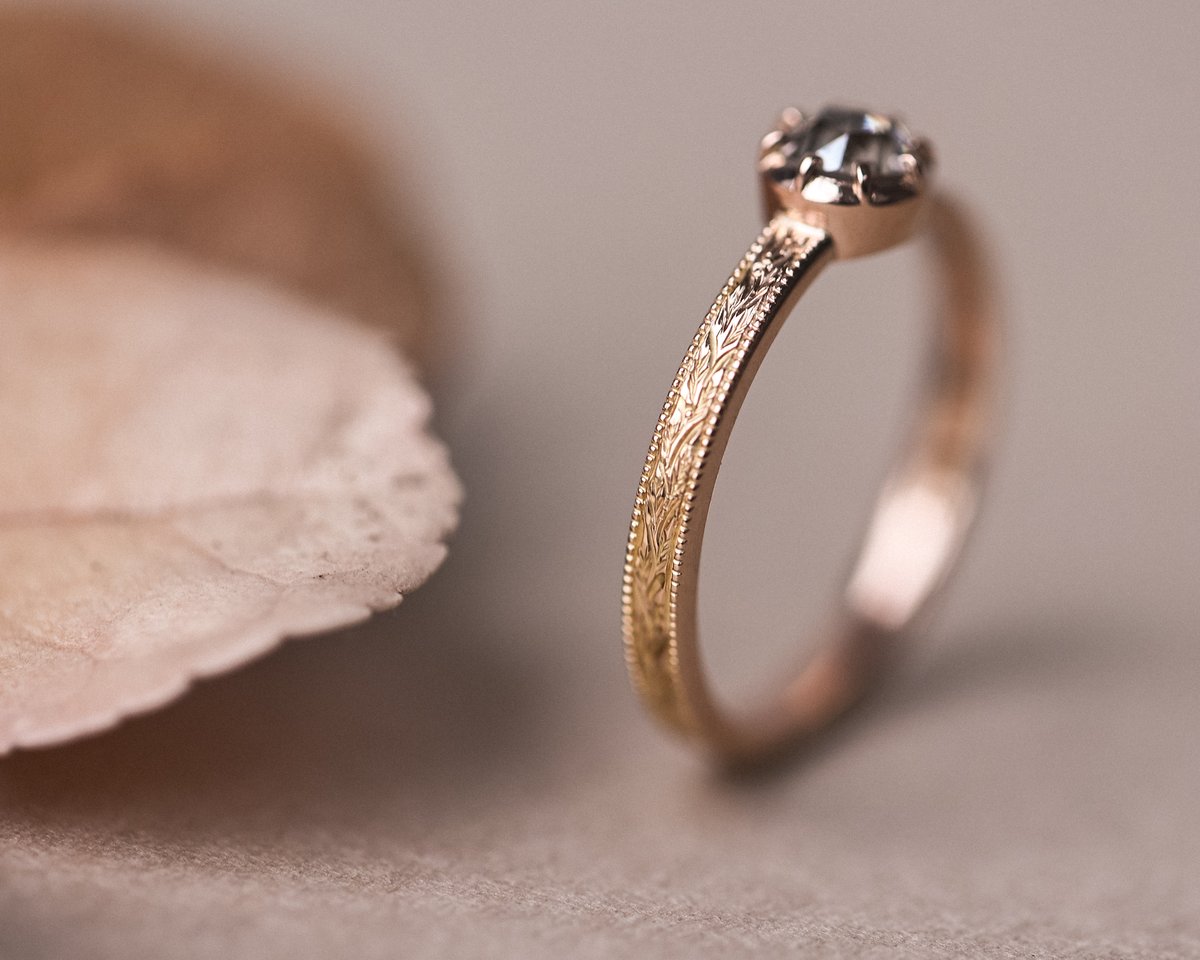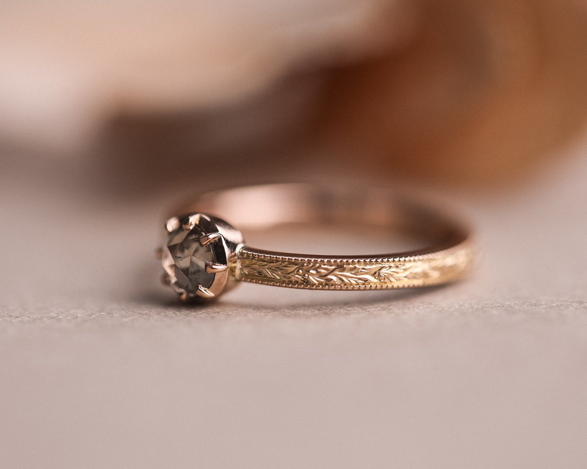4.28mm (0.39ct) Rose-cut, natural brown grey diamond , 18ct Rose gold milled edge with laurel engraved ring.