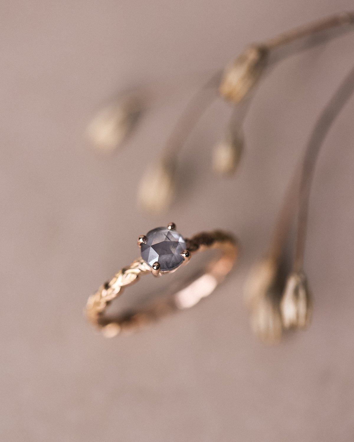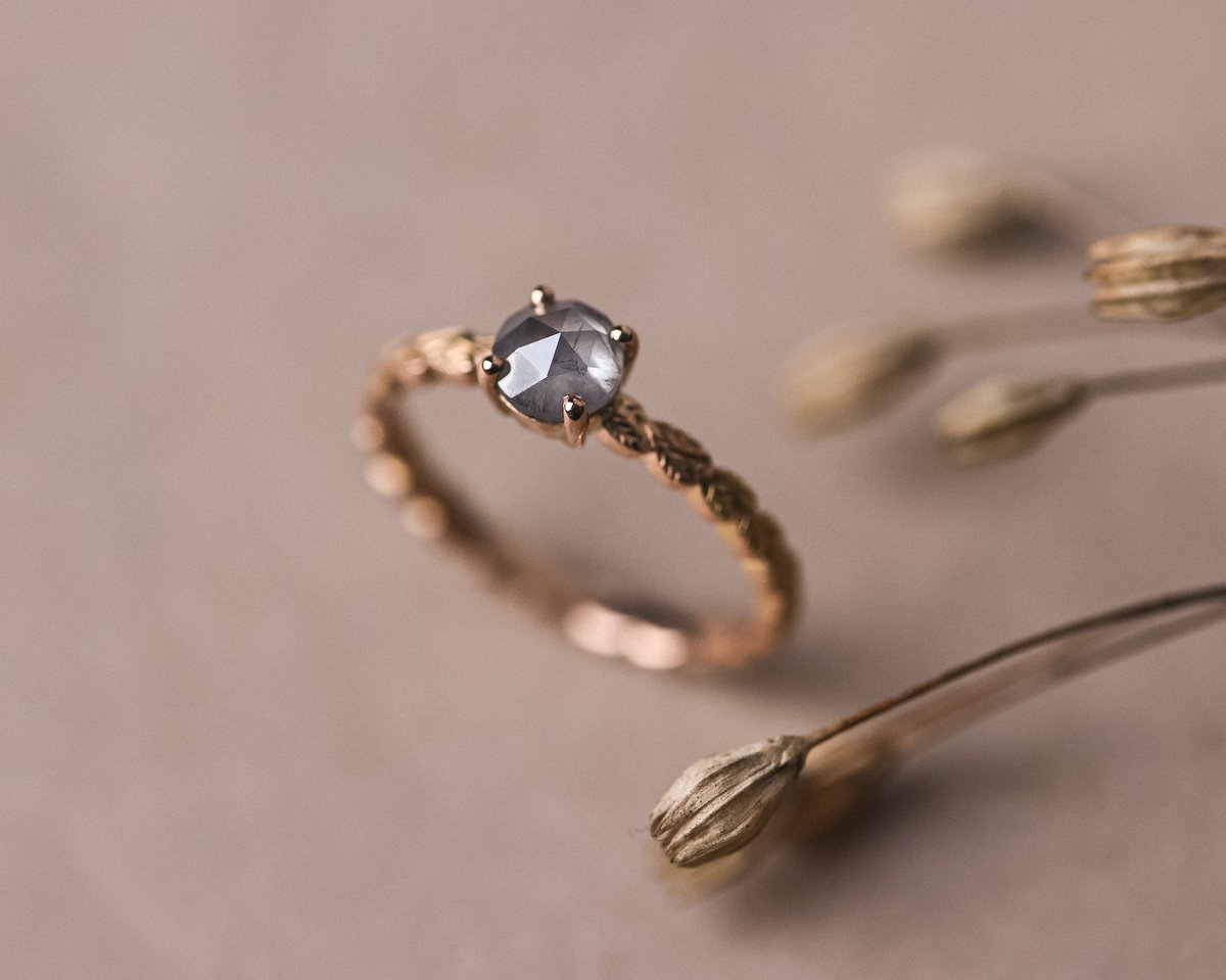 5.06mm (0.66ct) Rose-cut, natural pale grey diamond , 18ct Rose gold laurel leaf carved ring.