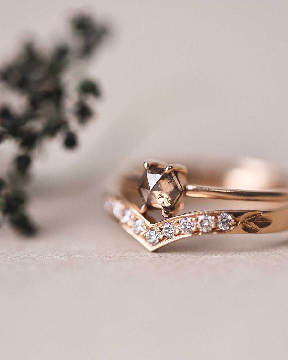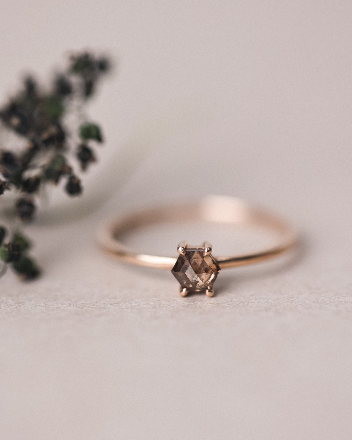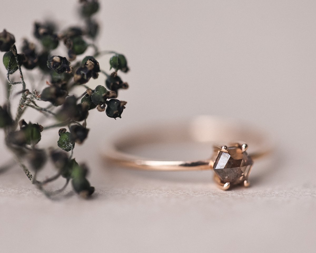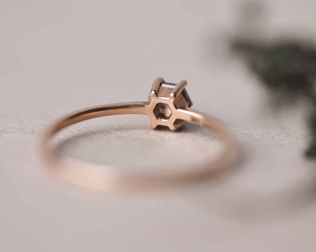 18ct Rose gold ring with a 4.41mm x 3.76mm 0.24ct brown grey hexagonal shaped diamond.