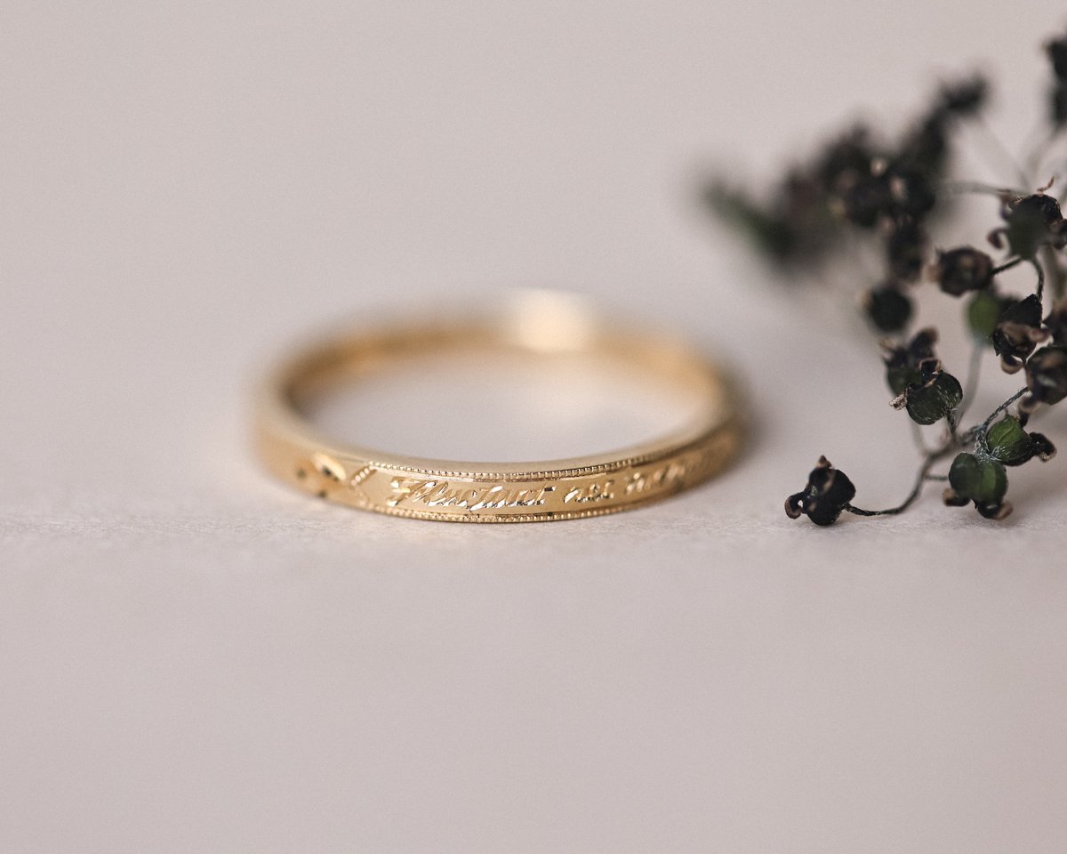18ct Yellow gold, 2mm width flat court ring with a mill-grain edge.