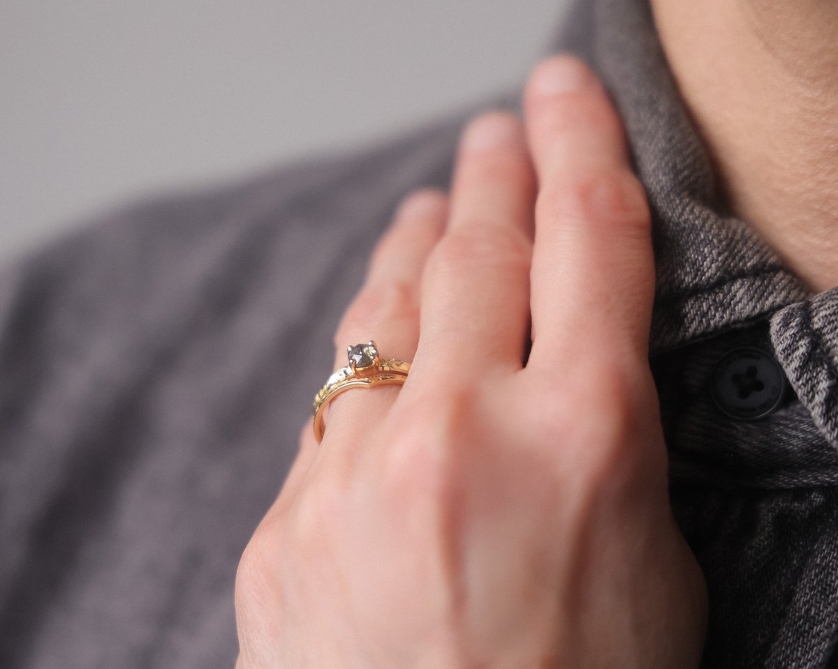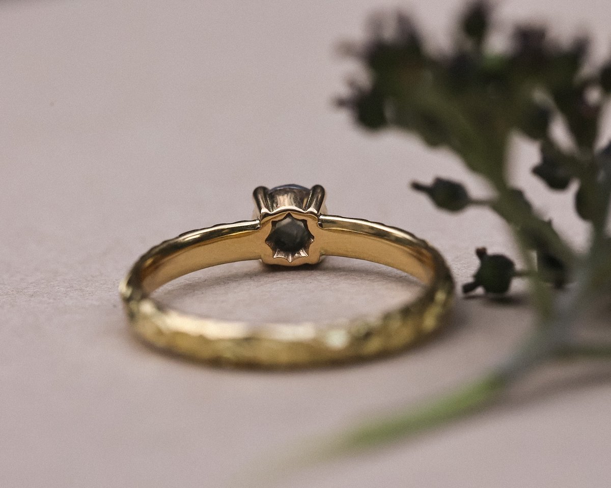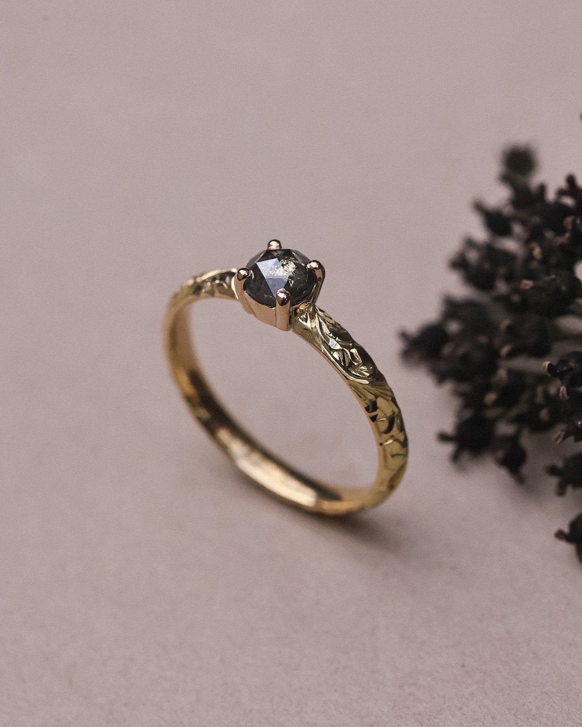 4.55mm (0.41ct) Rose-cut, natural grey diamond , 18ct yellow gold Floral engraved ring.