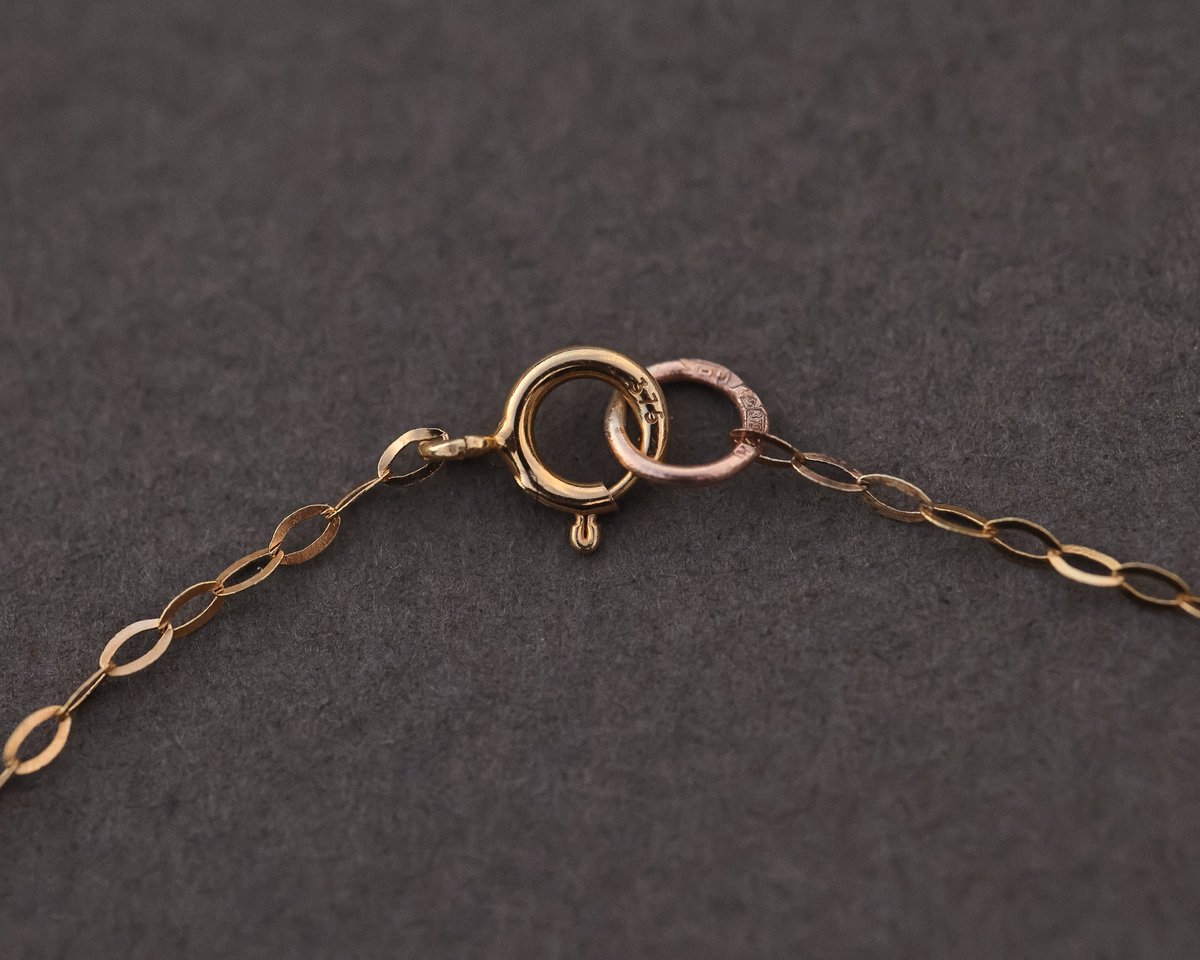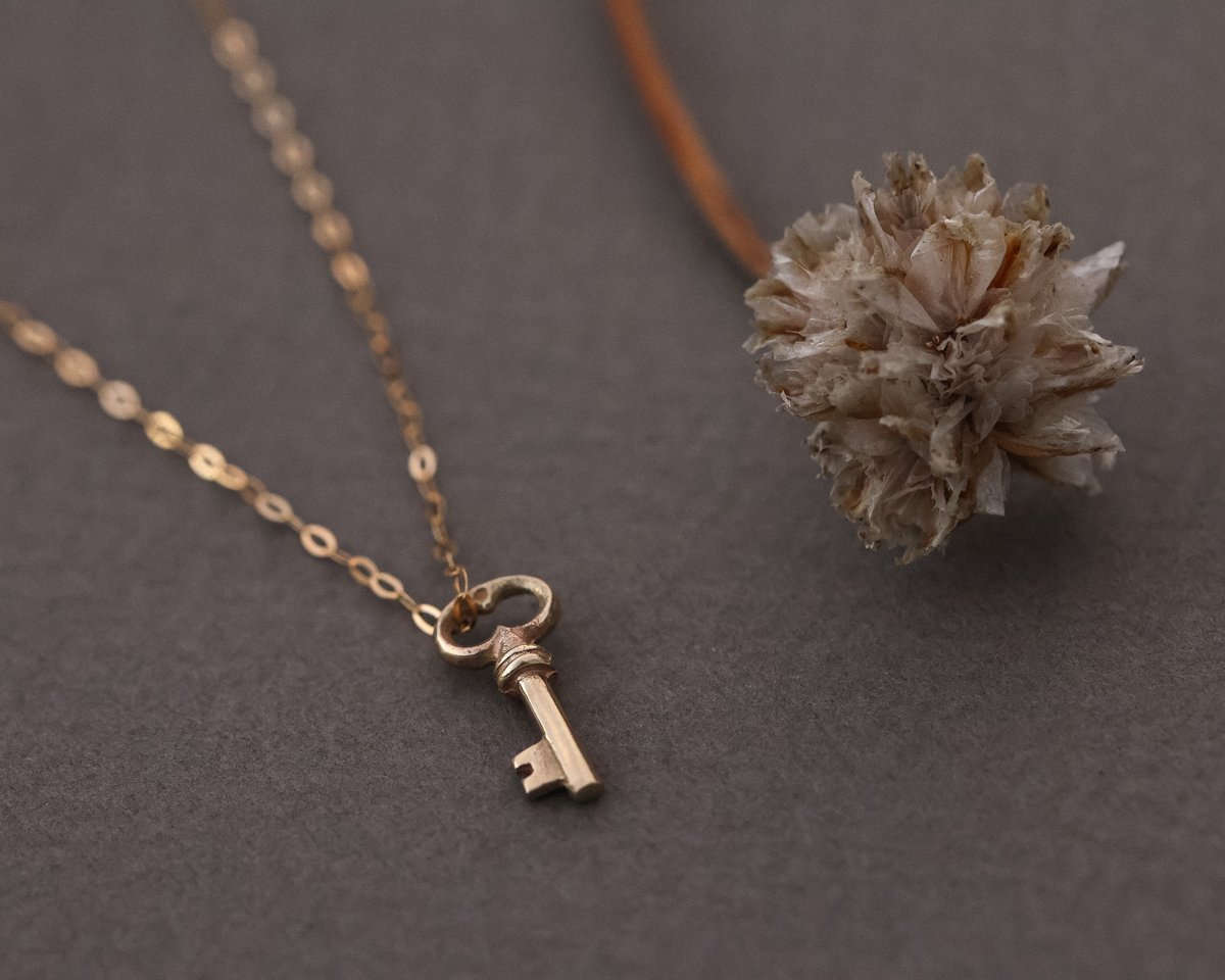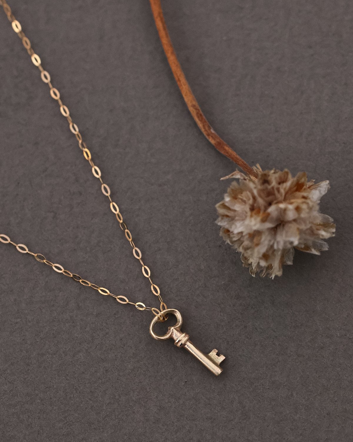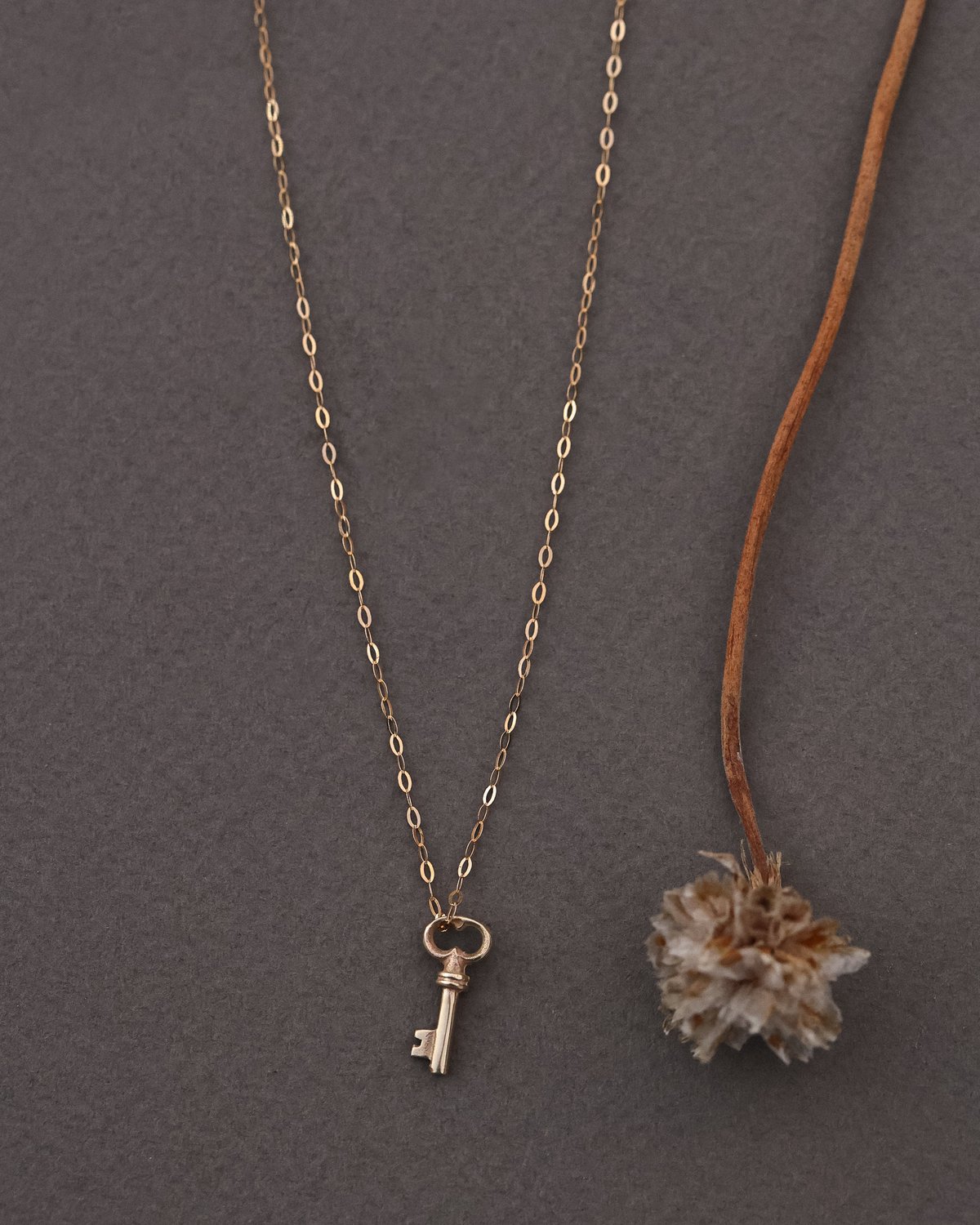 A tiny gold key is suspended on a 9ct gold fine faceted chain.