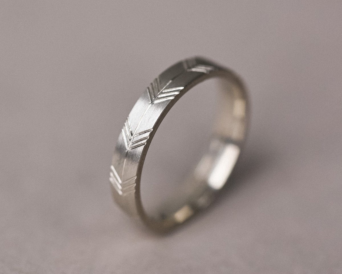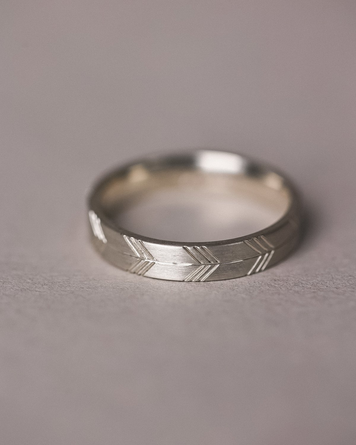4mm width, 9ct white gold, 'flat court', Japanese arrows engraved ring.