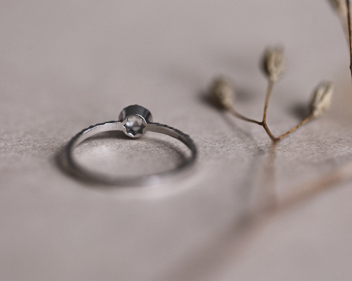White Rose-cut diamond, platinum band with faceted hand carved detail.